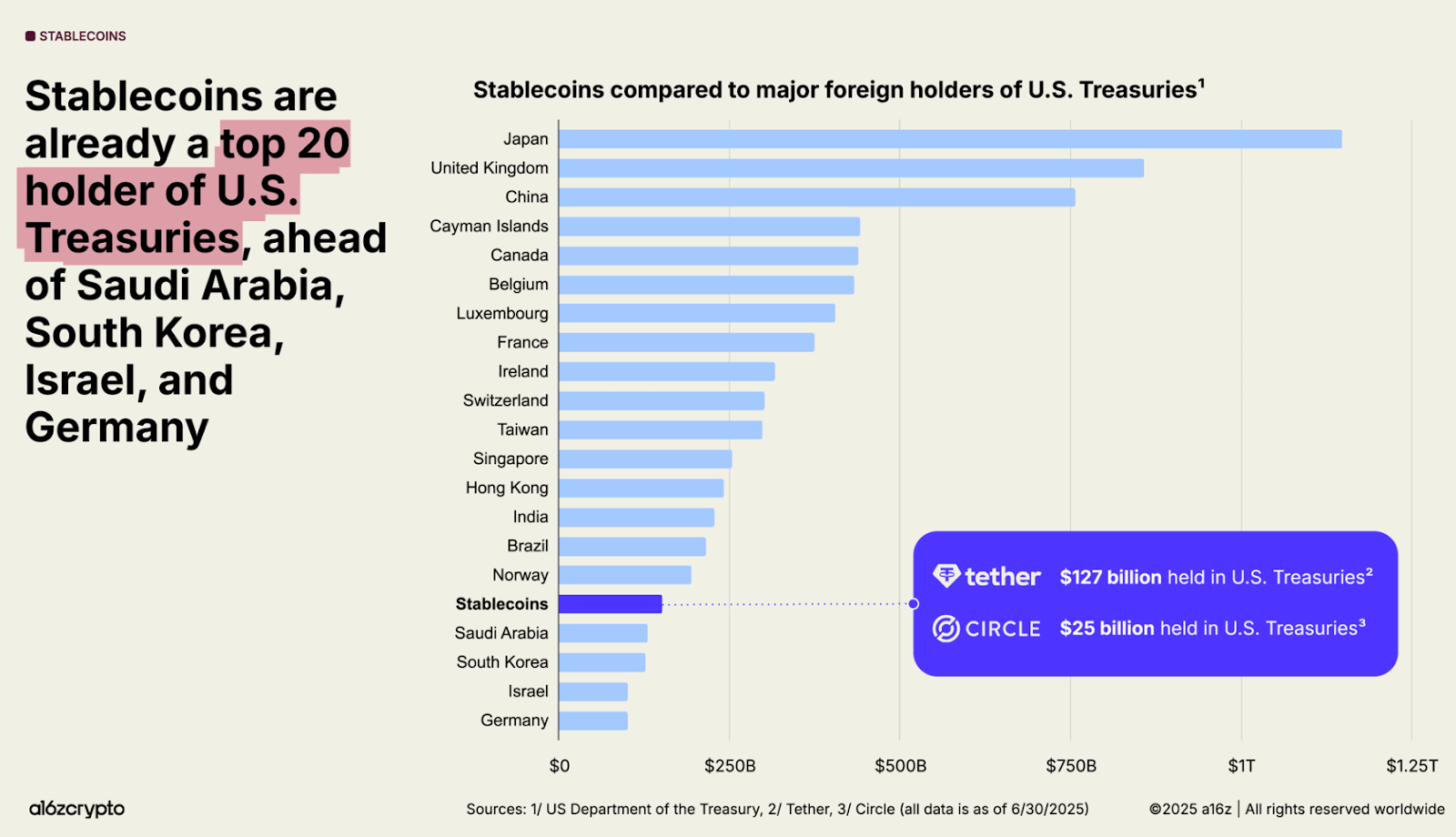 The global influence though really derives from the underlying treasury holdings. Tether alone now exceeds Germany in terms of its influence as an American creditor. If you want economic influence, holding nation state levels of American bonds and being a continual buyer is a very good way of doing it. Once the GENIUS act gets going, you can expect stable coins to jump into the top five on this list.