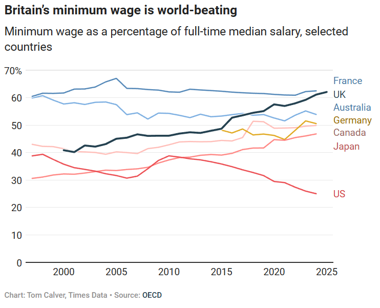 Not only are the additional costs in France high, the basic minimum wage cost is also huge. The next chart is rather misleading because the full-time median salary is a lot higher in the US than everywhere else. The fact that it is rising is causing the minimum wage to fall as a percentage. It is extraordinary though that the minimum wage in the US is under 30% of the average wage while it is over 60% in the UK and France. Where’s the incentive to do better?