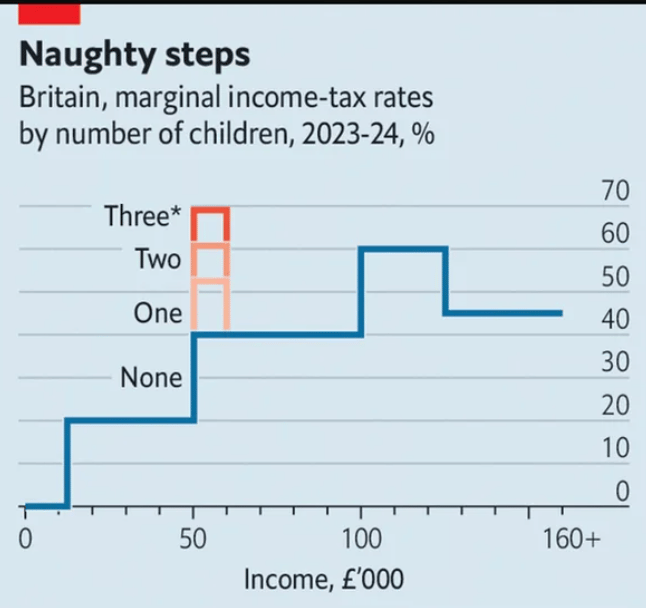 In the UK there are many tax cliffs which penalise people as their pay rises. As you approach £50,000 child benefits fall away. In the 23-24 tax year anyone earning £50-£60k with three children paid a 70% marginal tax rate. For two children 60%, for one child 55% (this has since been reduced by 5% in each category).
