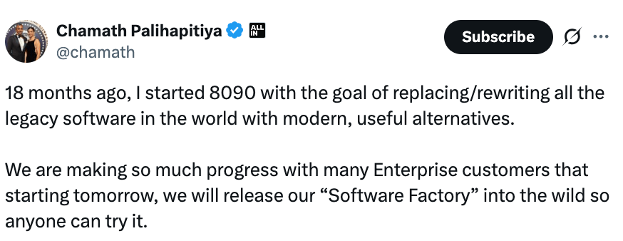 Chamath Palihapitiya launched something this week called 8090.ai. Essentially a company to replace all other software companies. It is literally a team of AI agents that builds or replaces specific software for your business.