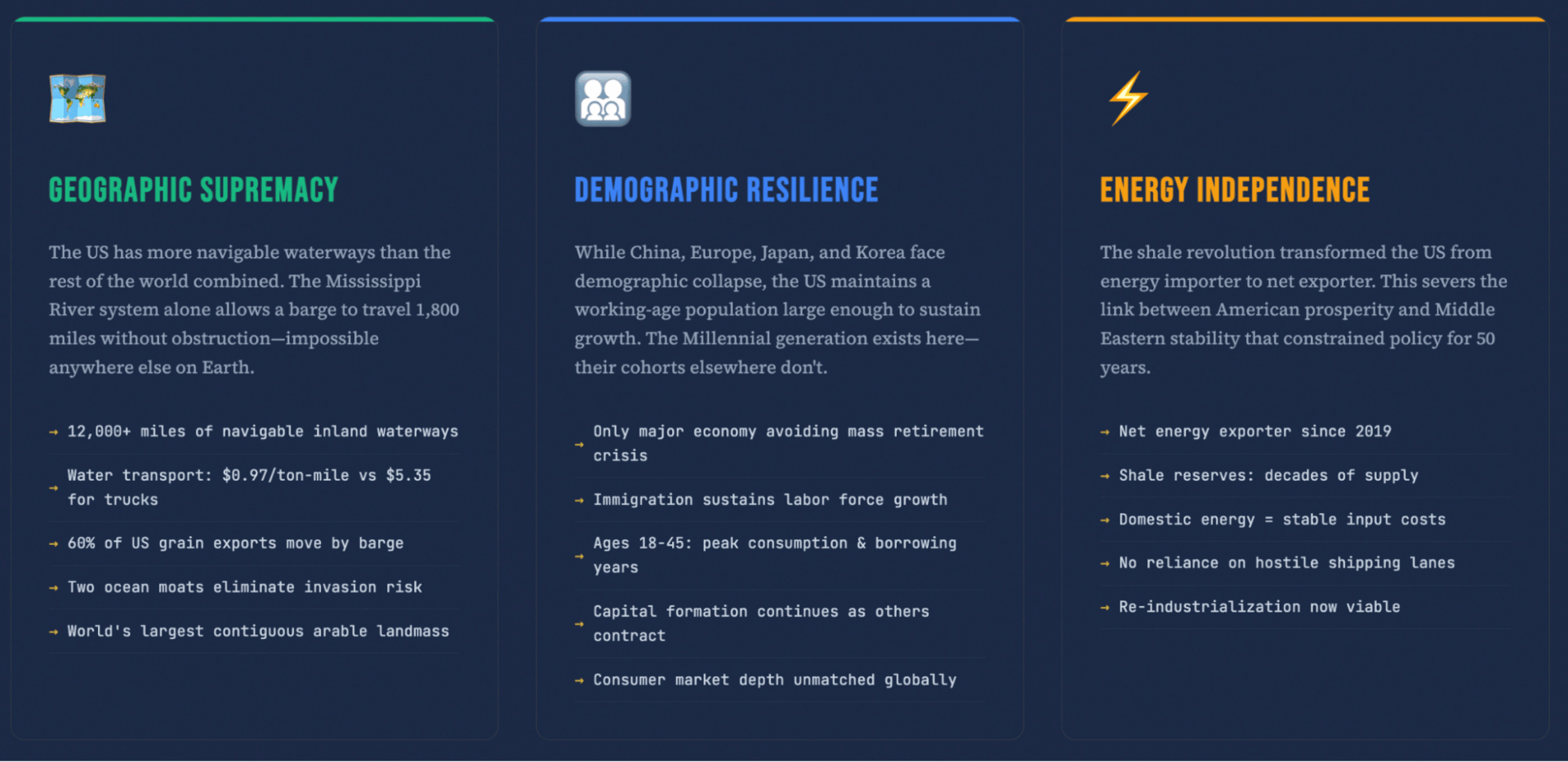 One thing it sees that the US understood and Europe didn’t is the importance of energy independence. The other thing is nearly everything in the list (save for the Geography) Europe could have if it wanted it.