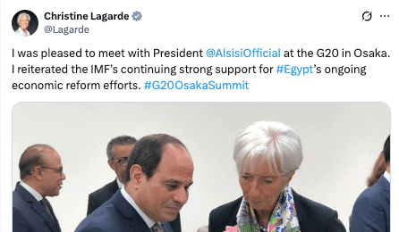 “Pleased”. If Christine is “pleased”, she is anything but. At the time of this meeting, Egypt's economic reforms were not going as well as the IMF had hoped. Nonetheless, the photo shows that Christine is engaged in the meeting.